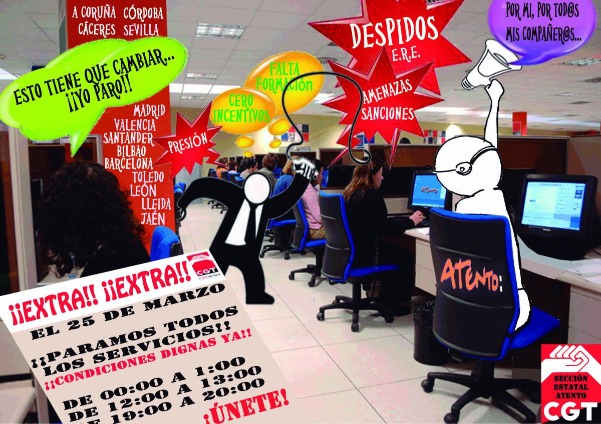 Por todo esto, la CGT en Atento ha decidido, junto con otros sindicatos, retomar las movilizaciones que llevamos a cabo a lo largo del año pasado convocando un primer paro de una hora por turno el día 25 de marzo.