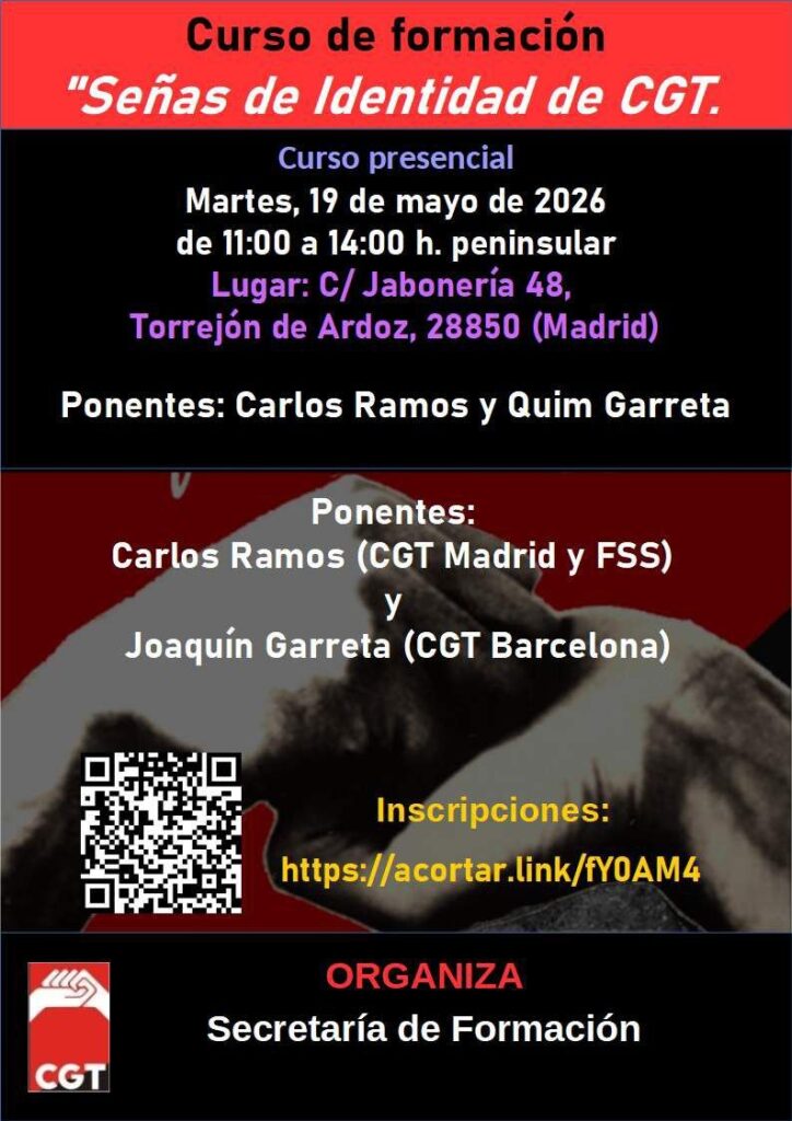 El próximo 19 de mayo, en Torrejón de Ardoz (Madrid), Carlos Ramos (de la Fundación Salvador Seguí FSS) y Joaquín Garreta (de CGT Barcelona) impartirán una formación sobre ‘Señas de Identidad’. Tendrá lugar de 11:00 a 14:00 horas en la C/ Jabonería nº 48. Es un curso presencial y tiene un límite de 50 plazas. Inscríbete aquí antes de que se completen: https://docs.google.com/forms/d/1w2JH8ghjgNMglFN8vmyHGl4emYluPc9d1KQ11_pU0i4/edit