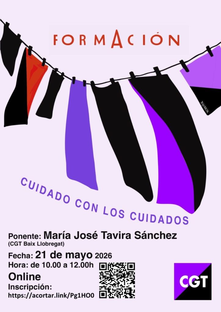 Y el 21 de mayo, de 10:00 a 12:00 horas, será la compañera Mª José Tavira Sánchez (CGT Baix Llobregat y ‘Mujeres Libertarias’) quien nos hablará sobre cuidados. Esta formación será online y puedes hacer tu inscripción en este enlace: https://docs.google.com/forms/d/1LdyOfTgSqPAn_WsX33h5X3nPZE8yEh3nfdwhIA2zJgM/edit