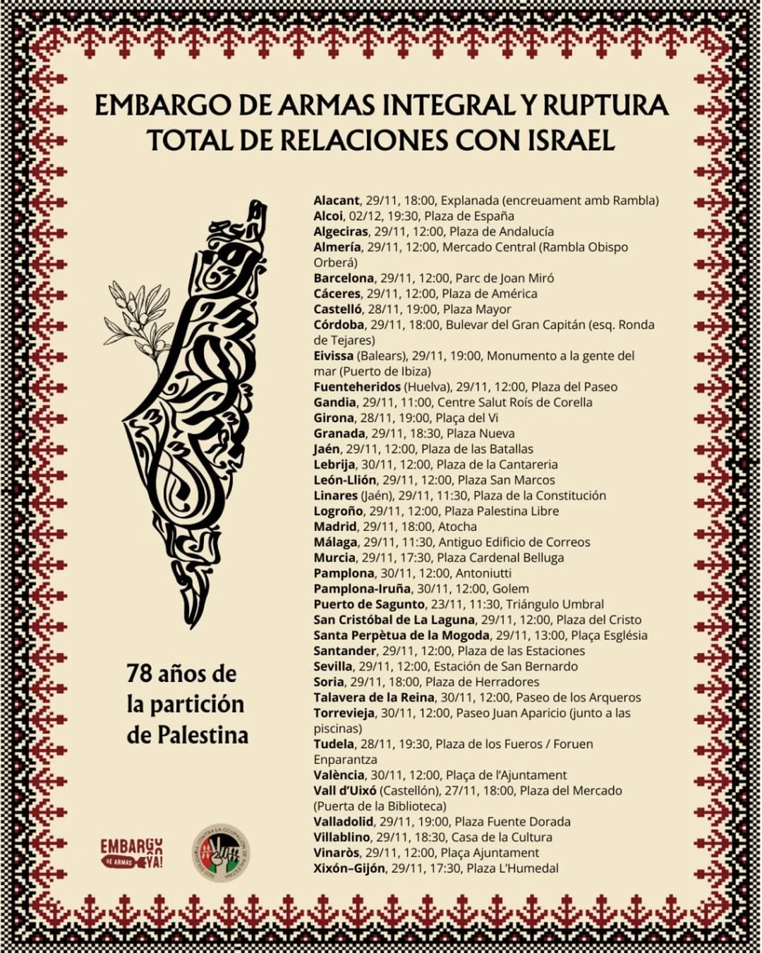 Volvemos a llenar las calles por PALESTINA y salimos los días 28, 29 y 30 de noviembre en más de 33 ciudades y pueblos (detalles en cartel adjunto)
