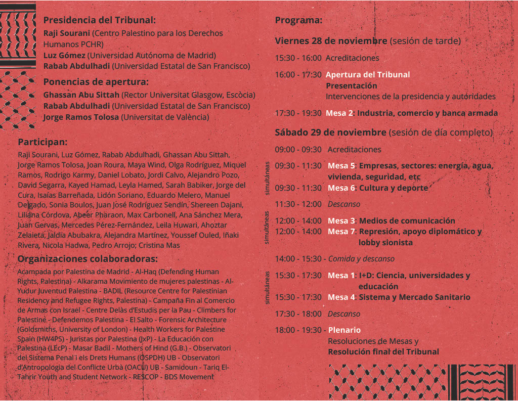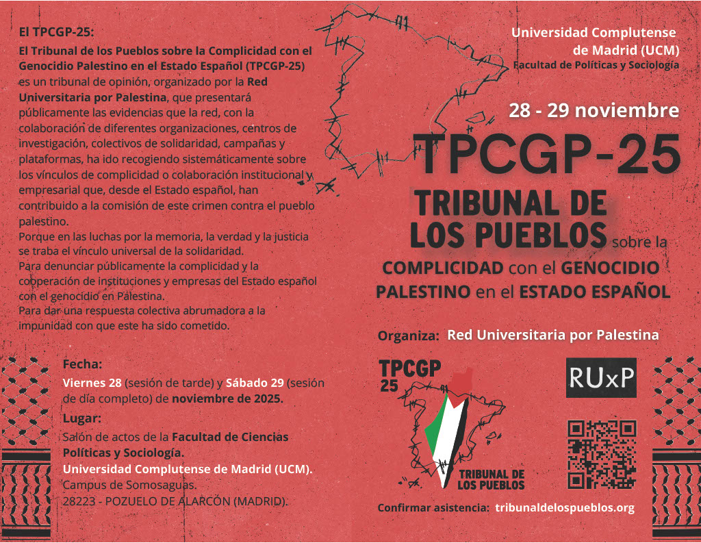 Este Tribunal de los Pueblos, como foro independiente y autónomo, constituido por 22 organizaciones, colectivos y campañas civiles, ha investigado durante los últimos meses las formas de complicidad con el genocidio palestino perpetradas desde nuestro territorio.